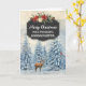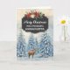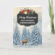 Frohe Weihnachten für eine Patcherkarte mit rustikalem Kalkboard-Muster und schneebedeckter Wasserfarbenwaldszene mit Hirsch und Vögeln.