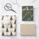 Eine Sammlung koordinierter Urlaubspapiere. Die eine hat einen beigen Gingham-Hintergrund mit einem dunkelgrünen Weihnachtsbaummuster, die andere ist ein beigefarbener Hintergrund mit einem weißen Polka-Punkt-Muster und die dritte ist ein koordinierendes dunkles Grün mit fröhlichen Weihnachten in weißer Typografie. Mischung und Übereinstimmung