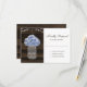 Rustikale Hochzeitskarte RSVP mit einem Mason-Glas mit blauen Hydrangea-Blume, die an der Saitenleuchte auf einem dunklen Holzhintergrund hängt.