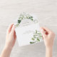 AUCH MIT EINEM QR CODE IM UAWG BEREICH ERHÄLTLICH. Dieses Design ist mit einem weichen Rahmen aus Efeu, Farnen und anderen Grünpflanzen um ein cremefarbenes Oval herum gestaltet. Personalisierte All-In-One-Einladungen sind eine einzigartige Kombination aus einer schön gedruckten, maßgeschneiderten Einladung und einer leicht zu abreißenden perforierten UAWG-Postkarte. Und sie sind so einfach zu bedienen! Man falte einfach, dann Siegel die Rückklappe mit den drei beiliegenden Klarkleben, und Post. Und wenn Ihre Gäste Ihre persönliche Einladung erhalten, reißen sie einfach die perforierte RSVP Karte ab und lassen sie in der Mail an Sie zurück!