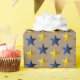 Ein rustikales Packpapier für den Weihnachtsurlaub mit leuchtend marineblau und goldenen Sternen in einem wiederholten Muster auf einem warmen Kraftpapier.