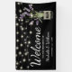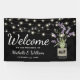 Country chic Begrüßungsbanner mit schwarzem Hintergrund, Saitenleuchten, ein Maurerkirsch mit lila Lavendelwaschern, eingewickelt in eine Burlap mit den Paarinitialen und eine Hochzeitsvorlage, die leicht personalisiert ist.