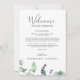 Diese rustikalen lavender wedding Begrüßungsbriefe & itinerary Karten sind perfekt für eine einfache und elegante Hochzeit im Freien. Das Blumendesign zeichnet sich durch Aquarelleukalyptus-Blätter und Grünpflanzen mit lila Wildblumen aus. Auf der Vorderseite der Karte befindet sich ein Begrüßungsschreiben, auf der Rückseite der Karte befindet sich der Hochzeitstag. Diese Noten sind ideal für Hochzeiten in Urlaubsort und Begrüßungstaschen für Hotelgäste.