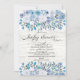 Schöne Aquarellblau blühende Babydusche Einladung Set auf einem rustikalen Holzboden mit einem handgeschriebenen Script-Schriftart und Koordinierung floralen Rücken.