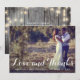 Carte de remerciements mariage rustique avec photo complète, un script "amour et merci" et typographie classique. De l'autre côté se trouve la texture du bois avec des lampes à cordes. Customisez le message pour le rendre vôtre.