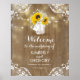 Fleurs de soleil, bois de grange, dentelle, lampes à cordes et pot en maçon avec fleurs à l'haleine de bébé affiche mariage de bienvenue