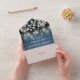Ein rustikales Ganzes in einer Hochzeitseinladung mit hübschem, grün-farbenem Blattwerk, Saitenleuchten, Maurergläsern und eleganter moderner Typografie auf blauem Holzpaneelhintergrund. Die Einladung enthält eine perforierte RSVP-Karte, die für Sie individuell adressiert oder links als leere Adresse für die Handschrift der Adressdaten Ihres Gastes verwendet werden kann. Entwickelt von Thisisnotme©