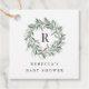 Eine Babydusche bevorzugt das Design eines Tags mit einem rustikalen Kranz mit grünem Blattwerk und Waldbeeren.