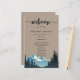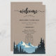 Belle feuille de papier du programme MOUNTAIN WEDDING avec une aquarelle en silhouette arborée et un grand "bienvenue" dans un script élégant ainsi que les détails du programme de mariage sur un arrière - plan rustique texturé kraft pour vous de personnaliser.