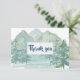 Rustic Mountains Adventure Baby shower Carte de remerciements. Merci à vos invités d'avoir assisté au baby shower et/ou pour les beaux cadeaux qu'ils ont apportés, et les jeux qu'ils ont joué. Le design est une aquarelle bleu vert avec des montagnes, des arbres et un lac.