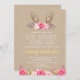 Rustic Peony et Deer Antler Wedding Invitations - présente un arrière - plan imprimé en papier kraft avec des bois de cerfs, des pivoines roses, des feuilles imprimés en feuille d'or et des lettres assorties. Les invitations à un mariage avec un cerf peuvent être entièrement customisées en utilisant le bouton "customiser" si vous avez besoin de plus d'options pour les polices, la coloration et plus encore. Vous pouvez mettre à niveau le stock de carte ou la forme des invitations ci-dessus.