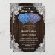 Rustic purple and blue floral wedding invitation featuring two floral hearts on a barn wood background adorned with white floral lace and string lights. Perfect card design for inviting your guests to your purple and blue rustic wedding party.