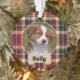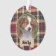 Cute stylish paw print Christmas ornament design for pet cat (or dog) name and photo of furry family member. This cute design features a dog bone nameplate with rustic classic red and tan black watch Scottish tartan plaid patterned background. This rustic red and tan watch Scottish tartan plaid pattern will be perfect as personalized gift.
