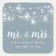 Maßgeschneiderte, mit Mr. und Mrs. Monogram personalisierte Aufkleber und Hochzeitstag, perfekt für die Gastgeschenk Hochzeit Etiketten, Begrüßtaschen oder Umschlag Aufkleber mit Ihren Einladungen. Das Design zeichnet sich durch leuchtende Saitenleuchten und Maurergläser auf einem staubblauen Hintergrund aus. Verwenden Sie die Designtools, um eine beliebige Hintergrundfarbe auszuwählen, die Schriftart und Farben zu ändern oder eigene Fotos hochzuladen, um ein einzigartiges Design zu erstellen.