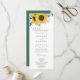 Ce programme rustique de mariage d'eucalyptus de tournesol est parfait pour un mariage campagnard. Le design floral bohème présente des tournesols jaunes, des fleurs roses rousses et une végétation d'eucalyptus vert chasseur dans l'aquarelle avec une élégante touche moderne de saumonier. Inclure le nom de la mariée et du marié, la date et le lieu du mariage, le message de remerciement, l'ordre de service, la fête de la mariée et un mémorial optionnel "en mémoire d'amour".