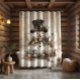 This watercolor-style winter scene makes a charming and rustic statement for a shower curtain. At its heart stands a classic snowman with a carrot nose, coal smile, and twig arms, dressed in a weathered brown scarf and a tall black top hat adorned with pinecones, holly, and twigs—evoking a homespun, woodland elegance. Two birds perch nearby, one playfully wearing a tiny hat, nestled among snowy pine branches and chopped logs. The softly falling snow and muted forest backdrop add a peaceful, cabin-in-the-woods atmosphere, perfect for bringing cozy, rustic charm to your bathroom decor.