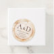 The design features a background of woodcut with rings, adding a touch of rustic charm to the overall aesthetic. Personalize the template with your own name initials, creating a monogram look that represents you as a couple. These round gift tags provide a glimpse of the rustic wedding feel your guests can expect at your upcoming celebration.