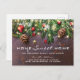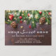 Cartes postales rustiques de pays nouvelle adresse avec un arrière - plan en bois foncé, branches d'arbres de Noël festives, décorations d'arbres rouges et dorés et lumières scintillantes.