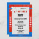 Eine Party Einladung vom 4. Juli mit rustikalen Holzpaneelen in Rot, Weiß und Blau mit Sternen und einem Gingham Panel. Der Text "4. Juli" ist ein stilisiertes Bild und kann gelöscht werden, wenn Sie benutzerdefinierten Text bevorzugen. Diese Einladung eignet sich perfekt für eine geplante GRILLEN oder Picknickfeier.
