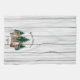 Rustic holiday kitchen towel with gray wood background and dark green trees. Photo templates via Pixabay licensed under CC0 and must be replaced with your own photo