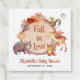 Niedliche Babydusche mit Geschenketiketten mit rustikalem Herbstmotiv mit einem Kranz aus Baumstamm, Wasserfarben von Waldtieren (Hirsch, Eichhörnchen, Bär und Fuchs), Terrakottaflüpfen und Kürbissen. "Fall in der Liebe", "Danke!" und der Name der künftigen Mutter sind in einem verbrannten orangefarbenen Skript geschrieben.