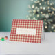 Rustikale, gefaltete Weihnachtskarte mit elegantem Design mit dem aufbearbeitbaren Gruß "Frohe Weihnachten" zusammen mit Ihrem Namen über einen Vintagen Stil Gingham Muster Hintergrund.