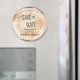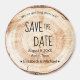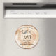 Personalisieren Sie diese einzigartige Hochzeit Speichern Sie die Date Circle Magnete. Es verfügt über eine bedruckte Holzkornschneidscheibe und eine whimsical Typografie, die perfekt für Ihre rustikale Hochzeit geeignet ist.