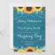Dieses rustikale Landdesign besticht durch weiße Saitenlichter und Spitzen mit Sonnenblumen und einem aquamarin türkisfarbenen Holzfußboden. Der Text mit anpassbaren Braut- und Bräutigamen und Veranstaltungsdetails erscheint in warmen, blassgoldfarbenen Weiß in beliebter Schrift und Serifentypografie. Sie können diese Einladung für Ihre eigene Hochzeit personalisieren, indem Sie den Text in der Vorlage ändern.