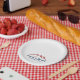 Rustikale Berge in Rot und Blau Hochzeitsempfehlung Papier Teller Dieses Design bietet eine rustikale rote Berg-Silhouette mit Ihrem benutzerdefinierten Text in Western Blau. Entworfen von Cedar und String; bitte zögern Sie nicht, uns zu kontaktieren, wenn Sie Hilfe beim Design benötigen.