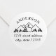 Maßgeschneiderte runde Rücksendeadressen-Aufkleber mit handgezeichnet Berghütte und Wäldern mit personalisiertem Familiennamen und Adresse.
