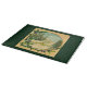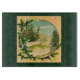 Ein Vintages rustikales Bild; eine kreisförmige Vignette mit Bergen und Schneebäumen in den Ästen, umgeben von einem Blumenmotiv.