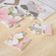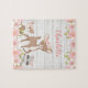 Dieses niedliche Waldtierpuzzle für Kinder enthält Illustrationen, wie zum Beispiel Hirsche, Racon und Fuchs. Die rosa Blume und der Script-Schriftart machen dies zu einem stilvollen Geschenk.