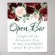 Ausgeklügelte Blumendusche, Geburtstag oder Empfang-Tafelschild "Open Bar" mit bordeauxroter und rot-rosa Kopfleiste mit marineblauer Akzent Blume, die mit botanischem Lorbeer und dunkelrot geschmückt sind. Aus der Kollektion "Boho Bloom" besteht dieses Layout aus reichen Bohemischen Wildblumen mit strahlenden Blüten und Eukalyptusblättern. Für andere Farben oder passende Produkte, besuchen Sie bitte den JustFharryn Zazzle Store, oder kontaktieren Sie den Designer, c/o Fharryn@yahoo.com Alle Rechte vorbehalten. #bohochic #zazzlemade
