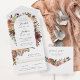 Eine wunderschöne Herbsthochzeit mit ihren Namen in Kalligraphie-Schriftzeichen, eingebettet in einen Bogen von Aquarellfarben-Blume und Botanicals in abgedämpften Erdtönen wie Bordeaux-Marsala, Rose, Elfenbein und Salbei-Grün. Personalisieren Sie Ihre Hochzeitsdetails unten. Die beiliegende RSVP-Karte und der Faltstil machen diese Einladung zu einer ansprechenden Wahl.