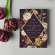 Elegante blumengeschmückte Hochzeitsfeiern oder Herbst- oder Winterhochzeiten prägen die Details, die in einem lang gestreckten Diamanten eingebettet sind, umgeben von Aquarellfarben, Rose, Mummen und Grün in rustikalen Herbstfarben wie Pfirsich, Elfenbein, Rot, Bordeaux und Grün auf einem lila, reichen Pflaumen. Die Goldfolienbespannung rundet das Design ab.