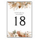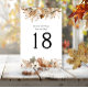 Tischnummer mit cremefarbenen, rot-gelben, bräunlichen Blüten, die die Wärme der getrockneten Blüten und des blühenden Blattwerks hervorrufen. Mit seiner gemütlichen Palette und seinem inspirierten Design eignet sich das Hotel besonders für eine Hochzeit im Herbst. Die sanfte Schönheit der Saison wird hier gefeiert und die Gäste werden zu einem Festessen eingeladen, das sich intim und bezaubernd anfühlt.