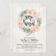 Rustikales Land böhmische Hochzeitseinladungskarte Design mit rosa/pfirsichfarbenen Rose und eucalyptus Blätter Kranz mit weißem gewaschenen Holzplanken Hintergrund und Monogramm mit Blumenecke hinten.