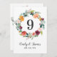 Rustikale Hochzeitskarten im romantischen Stil sind mit Zahlen versehen, die von einem sommerlichen und herbstblumigen Kranz mit wunderschönen Rose, Dahlien, Blume und Grünpflanzen gerahmt sind, in einer herrlichen Herbstpalette mit bordeauxroten, goldgelben, pfirsichfarbenen, rot-rosa und grünen Farbtönen.