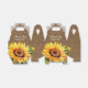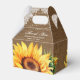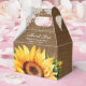 Bringen Sie Ihre Brautparty-/Hochzeitsgeschenke in diese romantischen, rustikalen Blumenkästen mit Sonnenblumen auf einem mit weißem Blumenmotiv und Lichtern geschmückten Schoß.