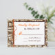 Rustikales Land Camouflage Jagd Bäume Bark Hochzeit RSVP mit einem gedruckten orangefarbenen Garnbogen und bedrücktem Rahmen rund um den Wortlaut. Der Hintergrund ist eine Tarnung Baumrinde Design. Der Garnbogen ist nur ein bedrucktes Design, nicht ein wahres Seil. Diese sind so konzipiert, dass sie den Einladungen zur Hochzeit von Camouflagen entsprechen: