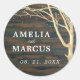 Rustikaler Dar Wood Winterbaum Weiße Script Hochzeitssticker. Die Namen von Braut und Bräutigam und das Hochzeitdatum in weißer Schrift auf rustikalem Holzhintergrund mit einem Winterbaum mit weißen Schneeflocken. Klicken Sie auf den Link Sammlung unter dem Aufkleber, um weitere passende Artikel zu erhalten.