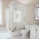 Ein schöner und eleganter Duschvorhang mit einem Kupferblatt-Skelett-Design und einer Auswahl an Taupe-Monogramm-Buchstaben auf einem weißen dekorativen Platz.