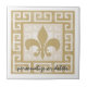 Die rustikale Eleganz dieser dekorativen Fliese erhöht jeden möglichen Dekor. Die Fliese kennzeichnet ein GoldLiliensymbol in einem griechischen Schlüsselmusterentwurf. Personifizieren Sie mit Ihrem Namen oder Mitteilung oder löschen Sie den Text und behalten Sie gerade den Entwurf.