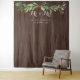 Eine wunderschöne Foto-Kulisse oder Foto-Messestand für Ihre Hochzeit, mit einer Aquarellanordnung von grünen Eukalyptusästen auf einem gemalten dunklen Holzhintergrund, "Mr. & Mrs." in White Script Schriftart, personalisiert mit Ihren Namen und Hochzeitstag.