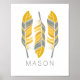 Ein Trio aus stilisierten Federn in erdigen Tönen aus Gelb, Gold, Grau und Creme, personalisiert mit dem Namen Ihres Kindes oder einem beliebigen Text Ihrer Wahl.
