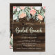 Die rustikalen und trendigen Brautparty-Brunch-Einladungen sind mit Aquarellfarben-Blume und Blätter in sanften Rosa-, Pfirsich-, Weiß- und Blautönen gestaltet. Moderne Goldtöne aus Imitat auf braunem Holzhintergrund.