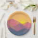 Papier Teller mit einer grafischen Abbildung mit vielen Berggipfeln mit hellgelbem Sonnenlicht hinter den Bergen. Mit geometrischen polygonalen Formen gefertigt. Einfaches minimalistisches Design. Die Farben reichen von dunkelblau bis wüstenrot.