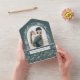Dieses einzigartige Design enthält eine trendige, bogenförmige Fotovorlage mit einem weißen, gezeichneten winterlichen botanischen Rahmen auf einem salbeigrünen Hintergrund. Die Paneele enthalten ergänzende florale Grafiken, Textfelder und eine zusätzliche abreißbare Fotovorlage.