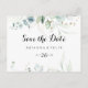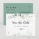 Diese rustikale, goldblütige, waagerechte Save the Date Postkarte ist perfekt für eine einfache Hochzeit. Dieses künstlerische Design zeigt handgezeichnet goldene Blüten und Aquarellen eucalyptus grünes Blattwerk, das die natürliche Schönheit inspiriere.