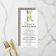 Ein Kreuz, umgeben von schönen grünen Blättern, schmückt ein modernes 3-Gänge-Menü mit Auswahl von Vorspeise und Nachtisch. Eine rustikale Speisekarte mit Holztäfelungen aus Imitat auf der Rückseite, die sich ideal zum Set auf den Tischen eignet, bevor die Gäste sie gedreht haben, um die Abendkurse zu verraten. Erhältlich auf einer traditionellen 4"x9" eleganten Karte. Einladungen, Weinetiketten und andere Artikel aus dieser Kollektion finden Sie in unserem Shop.